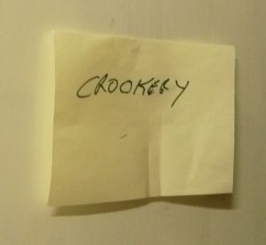 The garage sale went off like a shotgun. Hundreds of people moved through and we sold enough to go along way to meeting our mission commitments projections. It was a warm 34º C and the ambiance, free tea/coffee, and the mouth watering sausage sizzle meant that a lot stayed around to chat and pass the time of day. Packing up after lunch sees our siesta type sluggishness transform instantly to energetic and efficient movement. Almost ballet like, trolleys, boxes, tables and chairs waltz around customers looking for the last-minute mark-down. Within the hour – all is packed away and set up for Sunday church service. Of course, the local wag gets the last say at my expense. Grabbing the “crockery” sign, he made a slight change, then stuck it to my study door. I intend to leave it there (for a while, anyway).